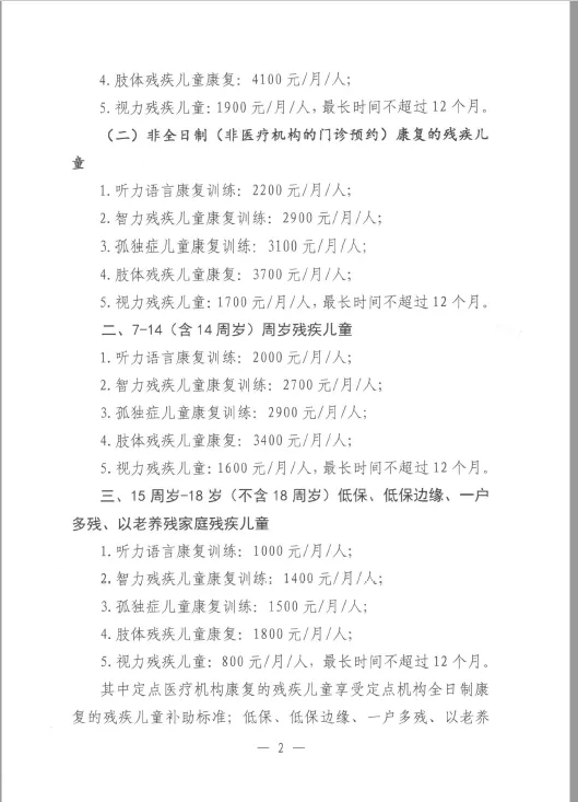 15周歲-18歲(不含18周歲)低保、低保邊緣、一戶(hù)多殘、以老養(yǎng)殘家庭聽(tīng)力語(yǔ)言殘疾兒童康復(fù)訓(xùn)練每人每年可享最高1.2萬(wàn)元的康復(fù)補(bǔ)助;智力殘疾兒童康復(fù)訓(xùn)練每人每年可享最高1.68萬(wàn)元的康復(fù)補(bǔ)助;孤獨(dú)癥兒童康復(fù)訓(xùn)練每人每年可享最高1.8萬(wàn)元的康復(fù)補(bǔ)助;肢體殘疾兒童康復(fù)訓(xùn)練每人每年可享最高2.16萬(wàn)元的康復(fù)補(bǔ)助;視力殘疾兒童康復(fù)訓(xùn)練每人可享最高0.96萬(wàn)元的康復(fù)補(bǔ)助。
