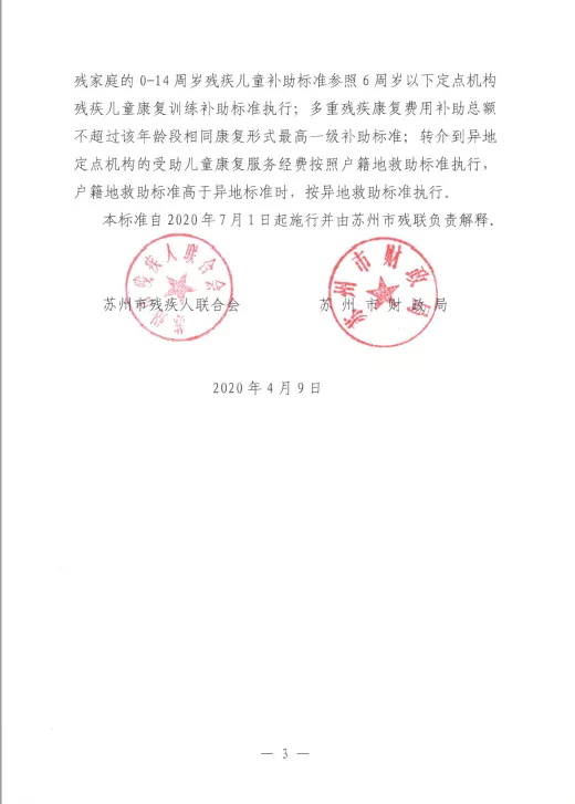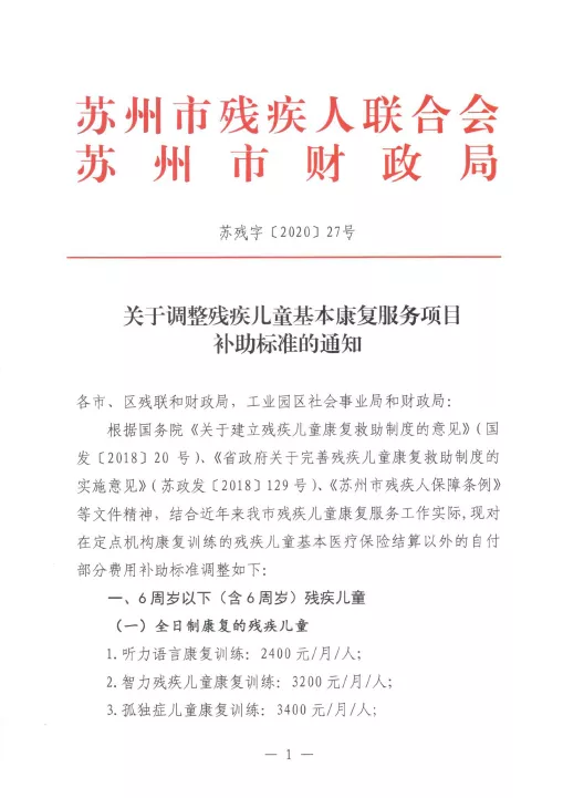 日前,蘇州市殘疾人聯(lián)合會(huì)、蘇州市財(cái)政局聯(lián)合下發(fā)《關(guān)于調(diào)整殘疾兒童基本康復(fù)服務(wù)項(xiàng)目補(bǔ)助標(biāo)準(zhǔn)的通知》。根據(jù)該通知,從2020年7月1日起,蘇州市對(duì)在定點(diǎn)機(jī)構(gòu)康復(fù)訓(xùn)練的殘疾兒童基本醫(yī)療保險(xiǎn)結(jié)算以外的自付部分費(fèi)用補(bǔ)助標(biāo)準(zhǔn)進(jìn)行調(diào)整,殘疾兒童基本康復(fù)項(xiàng)目補(bǔ)助標(biāo)準(zhǔn)再提高,補(bǔ)助年齡也進(jìn)一步擴(kuò)大至18歲。